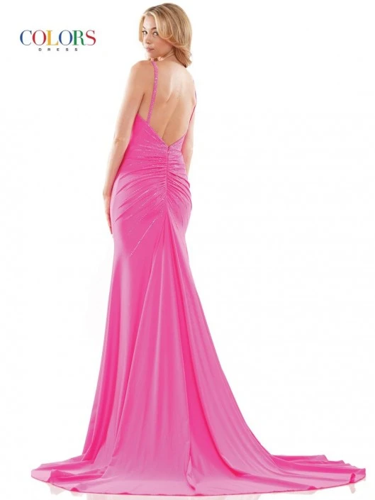 Style 2869 from Colors Dress is a satin lycra prom gown with an asymmetrical neckline design, ruched bodice, deep open back, high skirt slit, and a flowing train.