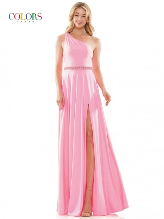 Style 2879 from Colors Dress is a one-shoulder satin lycra prom gown with an asymmetrical neckline, embellished belted waist, A-line silhouette, lace-up back, and a thigh high front slit.