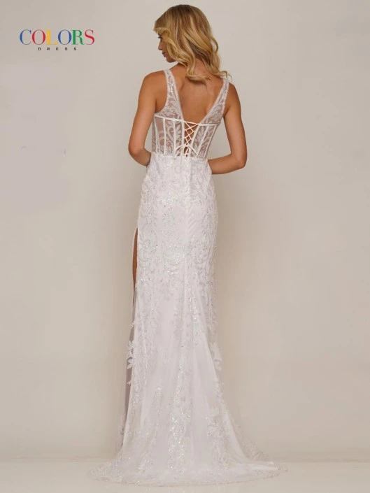 Style 2990 from Colors Dress is a glitter mesh evening gown with a V-neckline, sheer corset bodice, wide straps, open back with tie-up straps, thigh high front slit, and a train.
