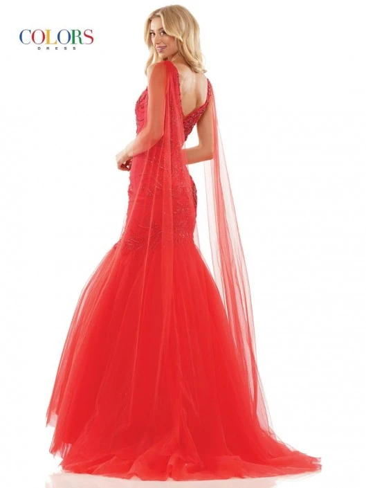 Style 2993 from Colors Dress is a prom gown with a V-neckline, mermaid silhouette, wide straps, V-back, sheer shoulder capes, and a mesh skirt.