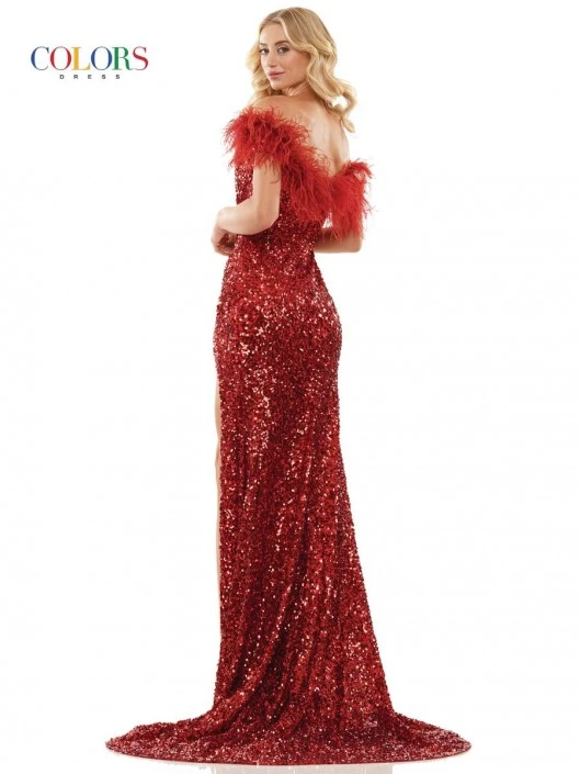 Style 2997 from Colors Dress is a sequin evening gown with a feather trimmed off the shoulder neckline, ruched bodice, open back, thigh high front slit, and a train.