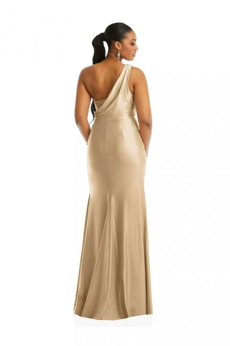 Style CS104 from Cynthia and Sahar by Dessy is a beautiful one-shoulder full length luxe stretch satin dress. This gown has an asymmetrical cowl back that shows off the shoulder. The slimming mermaid skirt has a slight train and thigh-high slit. The dress comes with optional cups for additional coverage.