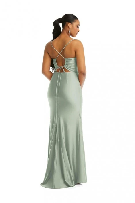 Style CS105 from Cynthia and Sahar by Dessy is a breathtaking floor-length dress with a cowl V-neckline and spaghetti straps. The dress has an open gathered tie-back as well as a zip closure. The luxe stretch satin fabric gives the slight train on the mermaid skirt a luminous sheen. The dress features a side front slit and additional cups for extra coverage.