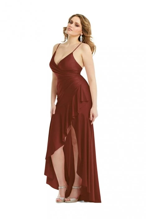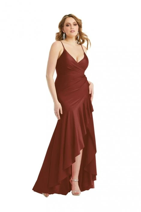 Style CS111 from Cynthia and Sahar by Dessy is a pleated wrap high-low luxe stretch satin gown. This dress has a romantic flair with the ruffle edge, pleated surplice bodice, and slight train. This dress is perfect for bridesmaids. The dress includes optional sew-in cups for extra support and coverage.