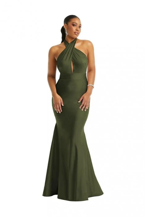 Style CS112 from Cynthia and Sahar by Dessy is a crisscross reverse halter neck luxe stretch satin mermaid gown. The dress features an open back, peekaboo cutout in the crisscross bodice, and a subtle train. The dress includes optional sew-in cups for extra support and coverage.
