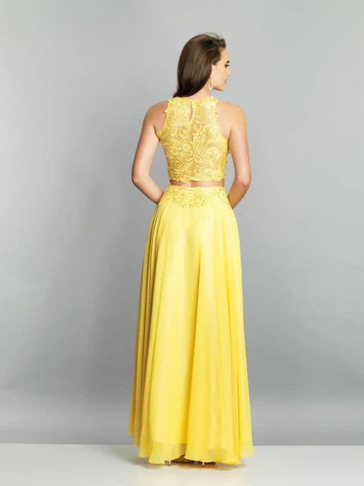 Style 10001W from Dave and Johnny is a plus size two piece high neck sleeveless prom gown with a lace top and chiffon skirt.