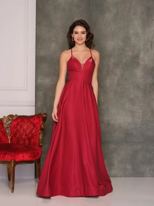 Style 10182 from Dave and Johnny is a classic deep V neck A-line prom gown with fitted waist and spaghetti straps.