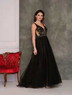 Style 10246W from Dave and Johnny is a floral embroidered tulle plus size prom gown with plunging neckline and jewel embellished waist.