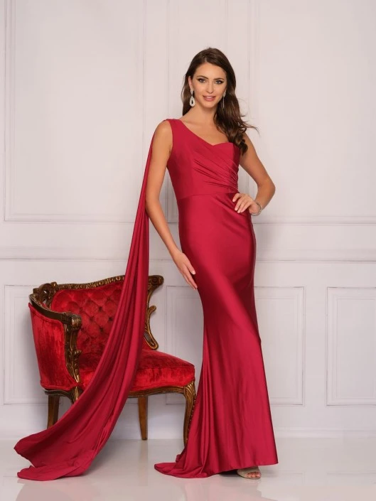 Style 10410 from Dave and Johnny is a stunning evening gown with ruched bodice and dramatic one shoulder draping train.