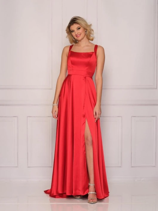 Style 10430 from Dave and Johnny is a modest square neck prom gown with fitted waist, cut out lace up back, and high slit skirt.