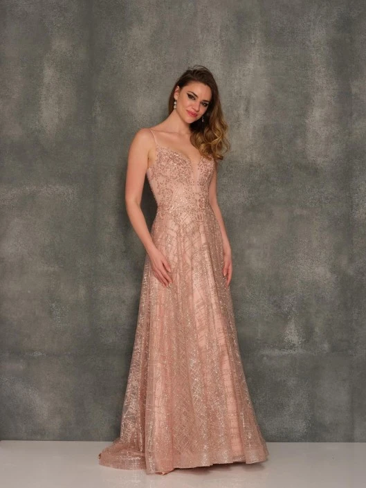 Style 10443 from Dave and Johnny is a sparkling tulle A-line prom gown with deep V neckline and spaghetti straps.