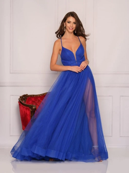 Style 10501 from Dave and Johnny is a fun and flirty pleated bodice prom gown with layered tulle skirt featuring a horsehair ribbon hemline and an open lace up back.