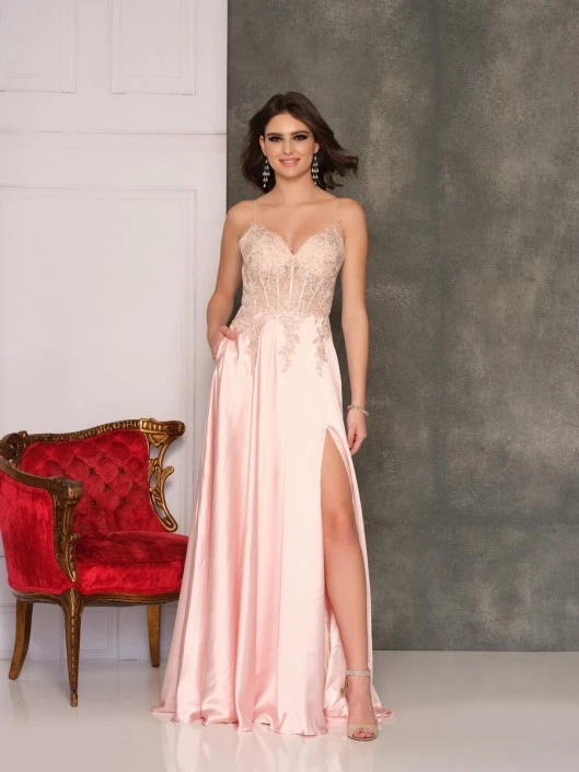 Style 10521 from Dave and Johnny is a sparkling sheer lace prom gown with boned corset bodice and spaghetti straps. The long sleek skirt features a thigh high slit that completes this sweet and sexy look!