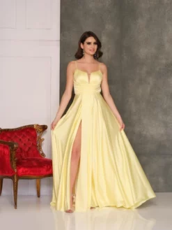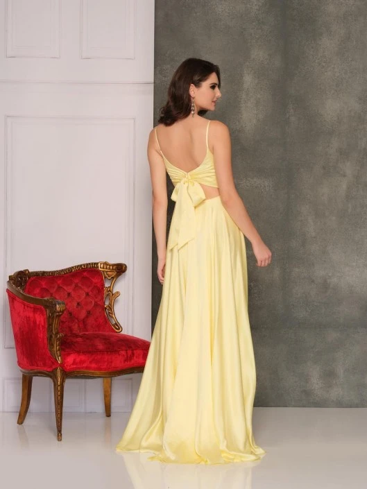 Style 10536 from Dave and Johnny is a lustrous prom gown featuring a heavily ruched bodice with spaghetti straps and a cut out bow back. This flowy skirt with high slit will have you floating across the dance floor with ease.