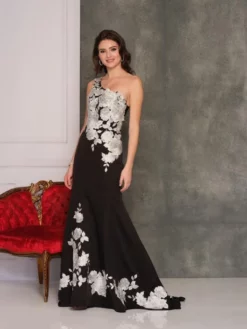 Style 10555 from Dave and Johnny is a one shoulder contrasting floral pattern A-line evening gown.