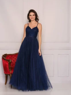 Style 10572 from Dave and Johnny is glitter tulle A-line prom gown with modest V neckline on a ruched bodice with an open scoop back. Perfect for a starry night evening!
