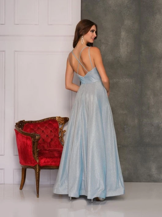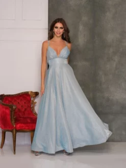 Style 10586 from Dave and Johnny is a shimmer fitted waist A-line prom gown with pleated bust, spaghetti straps, and open back.