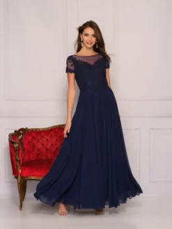 Style 10595 from Dave and Johnny is a full and flowy, chiffon A-line evening gown with lace illusion neckline and short sleeves. Ideal for prom, mother of the bride, or any special occasion.