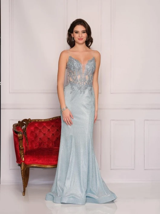 Style 10605 from Dave and Johnny is a sheer embroidered corset bodice spaghetti strap prom gown with shimmering skirt and horsehair ribbon hemline.