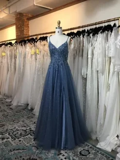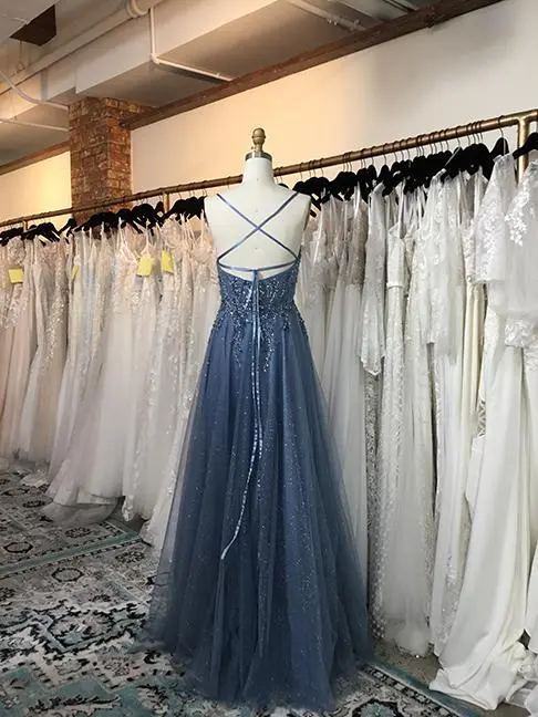 Style 10642 from Dave and Johnny is a dreamy layered, glitter tulle prom gown with embroidered V neck bodice, spaghetti straps, and an open tie back.