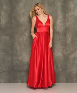 Style 10687 from Dave and Johnny is a prom gown with a V-neckline, A-line silhouette, banded waist, V-back, and pockets.