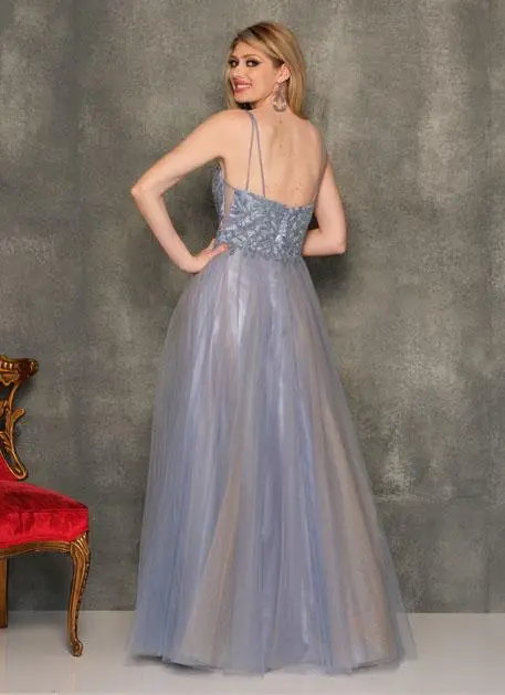 Style 10771 from Dave and Johnny is a prom gown with a plunging neckline with mesh insert, A-line silhouette, spaghetti straps, and an open back.