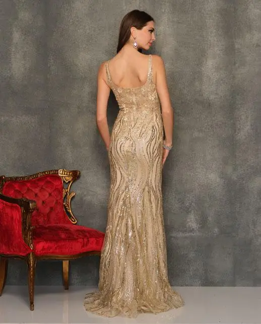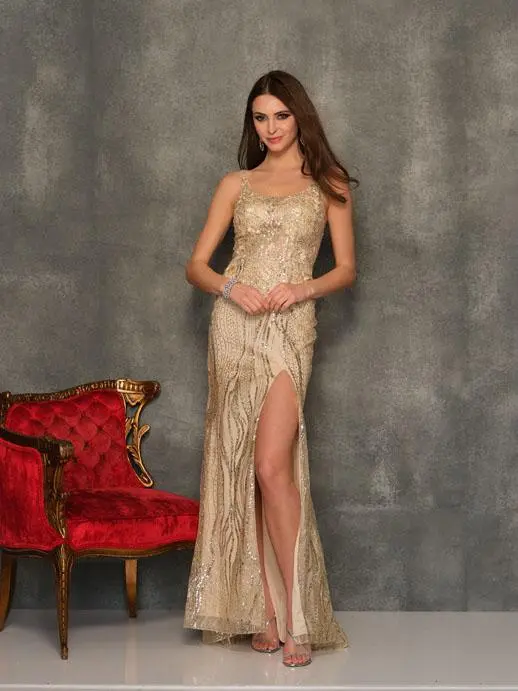 Style 10841 from Dave and Johnny is a sparkling prom gown with a scoop neckline, fitted silhouette, wide straps, thigh high front slit, and a train.
