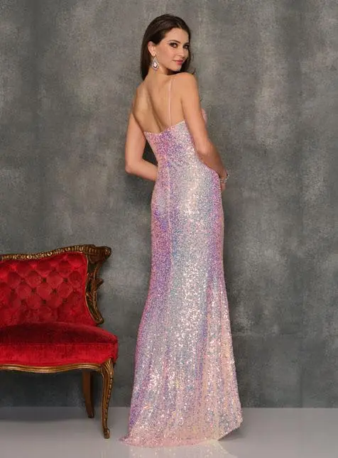 Style 10850 from Dave and Johnny is a sparkling prom gown with a sweetheart neckline, fitted silhouette, spaghetti straps, open back, and a thigh high front slit.