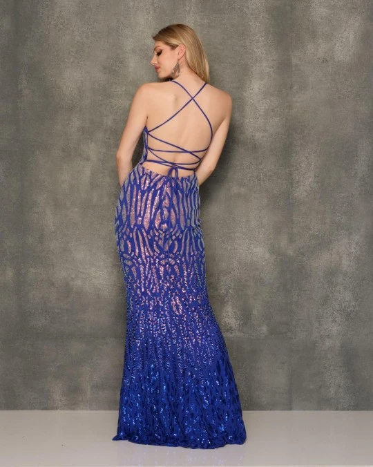 Style 10857 from Dave and Johnny is a sparkling design prom gown with a V-neckline, fitted silhouette, thin straps that lace-up and tie in an open back, and a train.