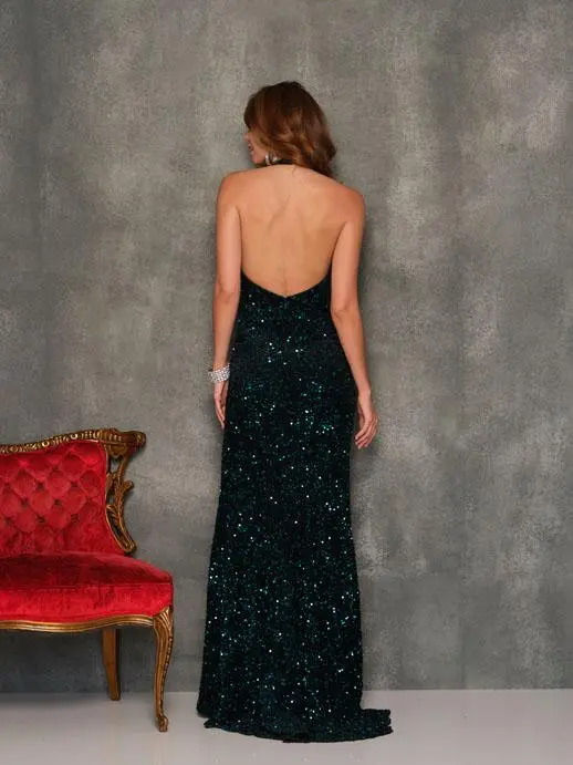 Style 10921 from Dave and Johnny is a sparkling prom gown with a plunging halter neckline with mesh insert, fitted silhouette, open back, thigh high front slit, and a train.