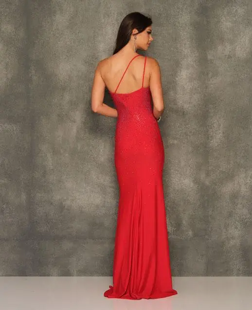 Style 10927 from Dave and Johnny is a one-shoulder prom gown with an asymmetrical neckline, fitted silhouette, thin double straps, open back, thigh high front slit, and a train.