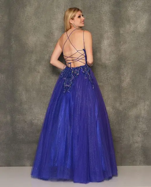 Style 10948 from Dave and Johnny is a shimmering prom ball gown with a V-neckline, applique bodice, and double spaghetti straps that lace-up in a low open back.