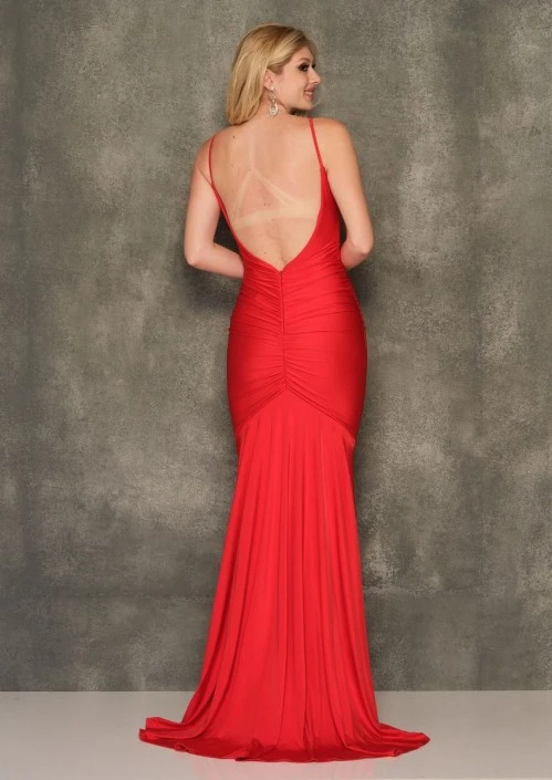 Style 11027 from Dave and Johnny is a prom gown with a V-neckline, fitted silhouette, ruching, thin straps, deep V-back, and a train.