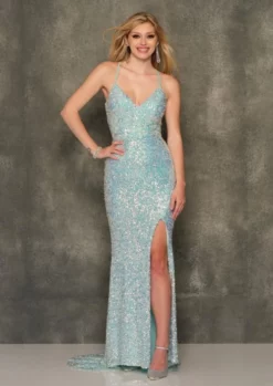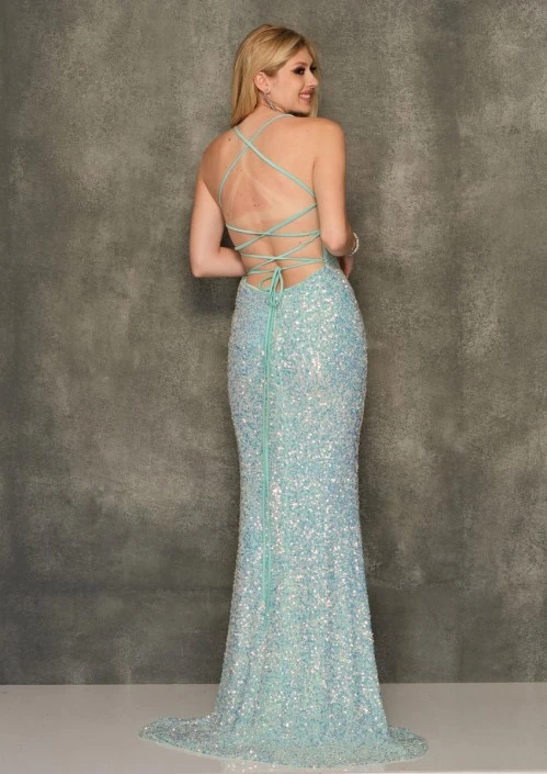 Style 11029 from Dave and Johnny is a sparkling prom gown with a V-neckline, fitted silhouette, thin straps that lace-up and tie in a deep open back, thigh high front slit, and a train.