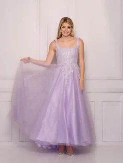 Style 11036 from Dave and Johnny is a prom gown with a straight neckline, A-line silhouette, wide straps, open back, and a train.