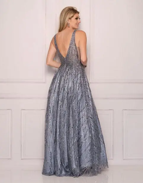 Style 11072 from Dave and Johnny is a sparkling prom gown with a plunging neckline with mesh insert, A-line silhouette, wide straps, and a deep V-back.