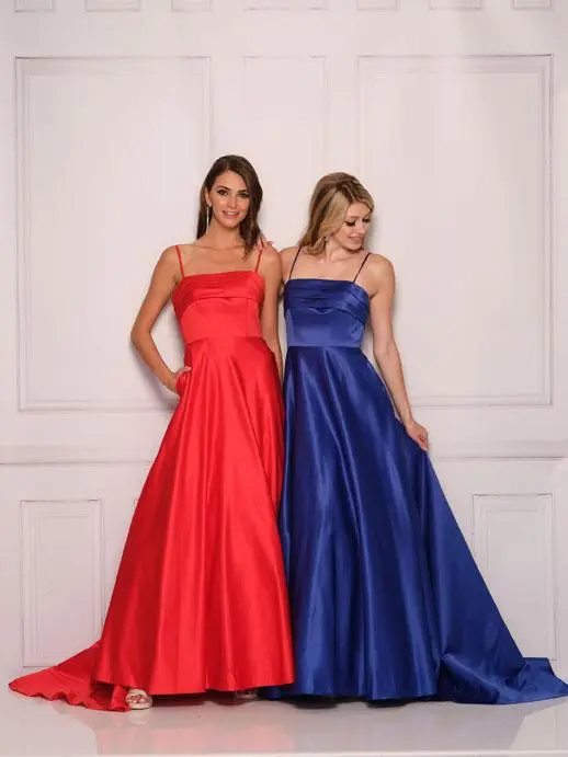 Style 11078 from Dave and Johnny is a prom gown with a pleated straight neckline, A-line silhouette, thin straps, open back, pockets, and a train.