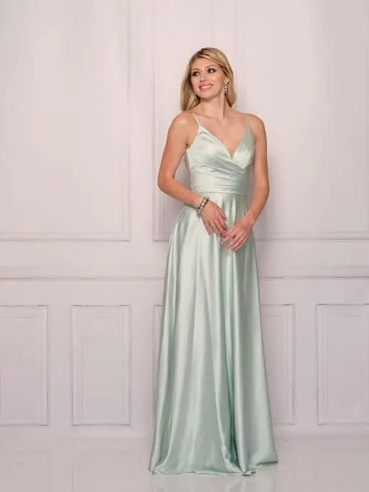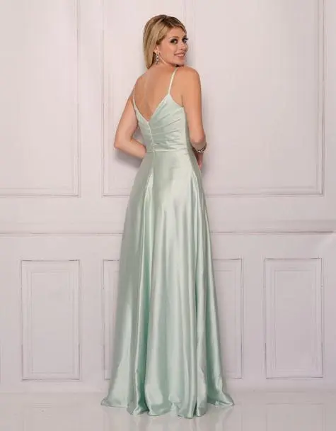 Style 11084 from Dave and Johnny is a prom gown with a V-neckline, A-line silhouette, draped pleated bodice, thin straps and a V-back.