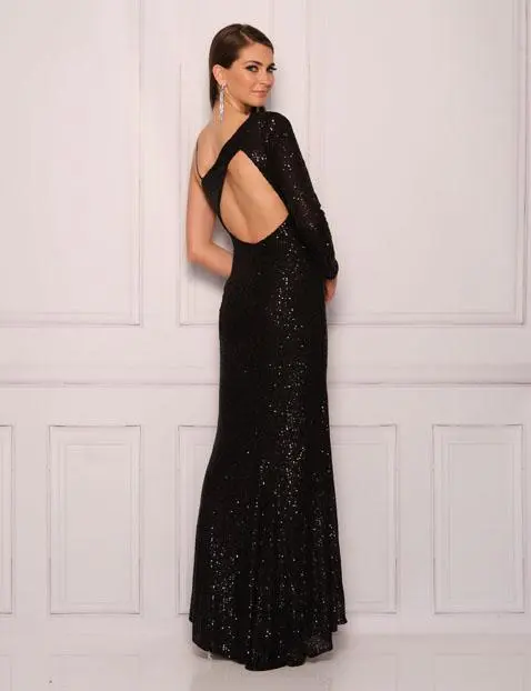 Style 11098 from Dave and Johnny is a sequin prom gown with an asymmetrical neckline featuring one long sleeve and one thin strap, ruching, cut-out back, and a thigh high front slit.