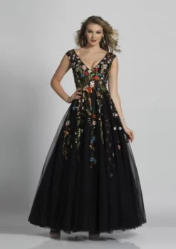 Style A5703 from Dave and Johnny is a V neck sleeveless long evening gown with flowers and a full skirt.