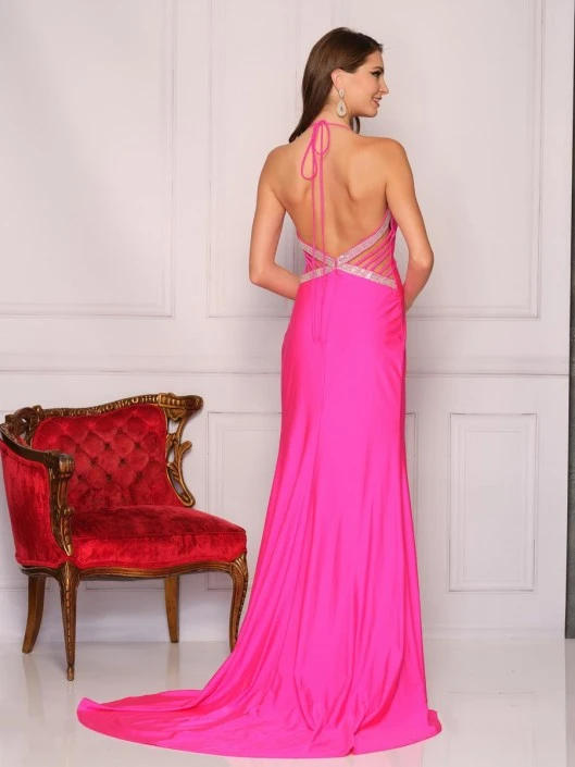 Style A9623 from Dave and Johnny is an open back halter neck slip dress with deep V neckline and unique jeweled back with train.