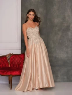 Style A9902 from Dave and Johnny is a sweet and modest A-line prom gown with an embroidered bodice and sweep train.