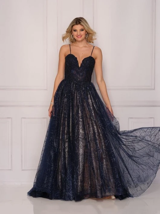 Style A9967 from Dave and Johnny is a sparkling starry night A-line prom gown with a layered tulle skirt, fitted deep sweetheart bodice, and spaghetti straps.