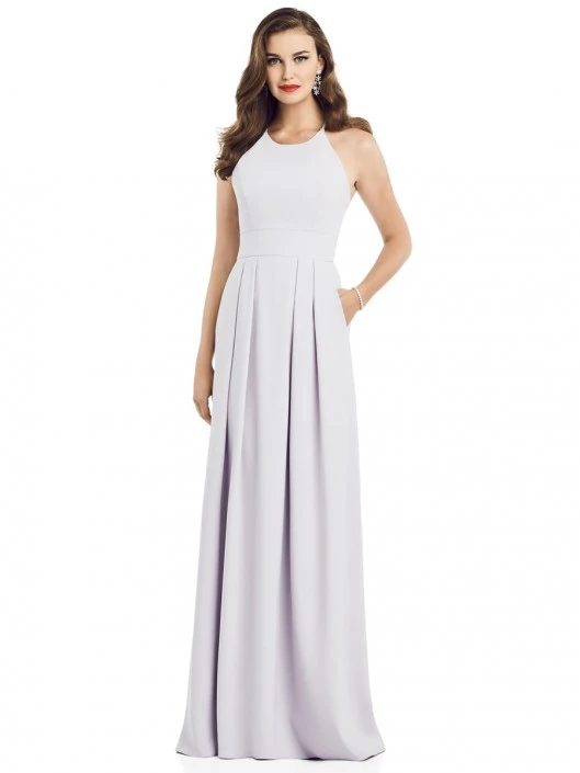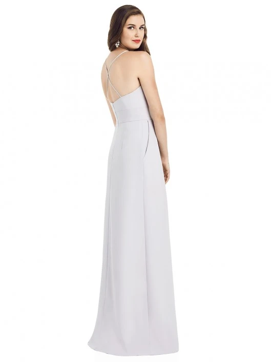 Style 3058 from Dessy Collection is a sleeveless crepe bridesmaid gown with inset waistband at the natural waist that has a pleated skirt with slash pockets and an open back with criss cross spaghetti straps.