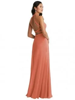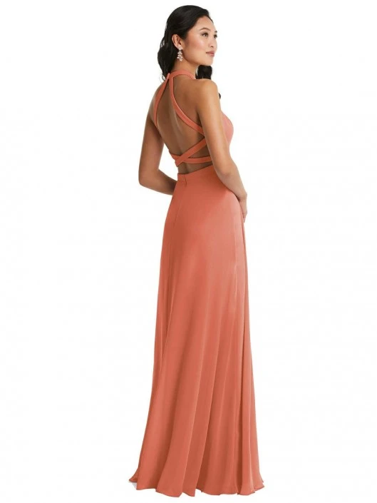 Style 3082 from Dessy Collection has an alluring criss-cross open back on this lux chiffon halter maxi bridesmaid gown. A modest stand collar and modified circle skirt complement this dramatic design.