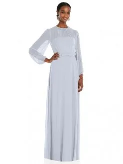 Style 3098 from Dessy Collection is a lux chiffon bridesmaid gown with bow belt waisted floor-length circle skirt. A whisper-thin blouson overlay lends a hint of mystery to its formal shirred jewel neckline and bishop sleeves. Soft and sophisticated, this long dress is perfect for a bridesmaid.