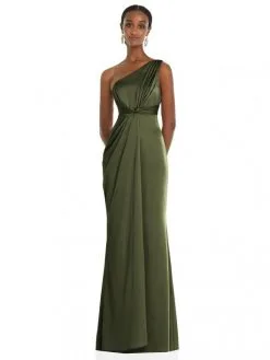 Style 3111 from Dessy Collection is an elegant one-shoulder draped twist empire waist bridesmaid gown. Featuring a faux wrap detail and paired with a twist bodice, this whisper satin one-shoulder gown is a simply stunning choice for a bridesmaid or your next formal event.