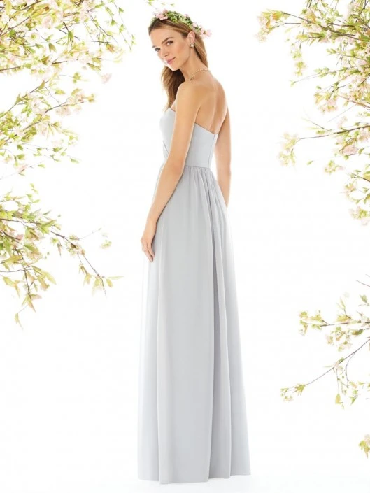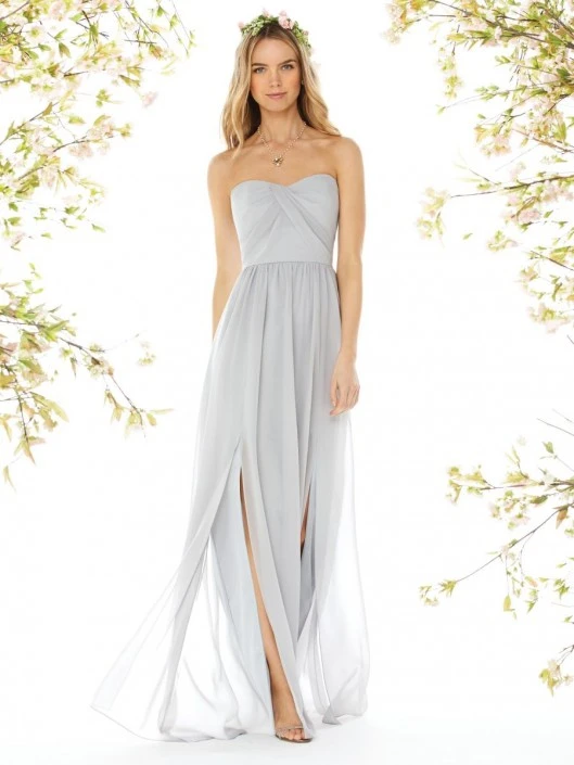 Style 8159 from Dessy Social is a full length strapless nu-georgette bridesmaid dress with sweetheart neckline and draped bodice. Shirred skirt with slits at princess seams.