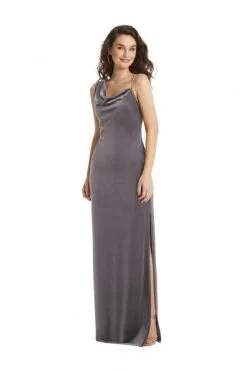 Style 8213 from Dessy Social is a lux velvet floor length bridesmaid dress that has an asymmetric draped neckline, a cowl back, and a high side skirt slit. This bias cut slip dress has just the right touch of elegance.