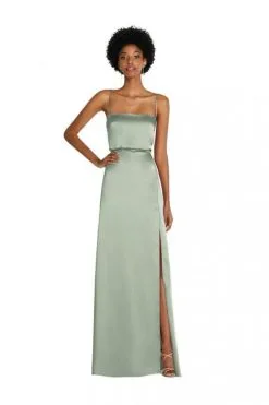 Style 8217 from Dessy Social is a floor length bridesmaid dress in lux charmeuse with a straight neckline and a high side slit skirt. This gown features a low tie back, flexible waist, and narrow feminine adjustable straps which help with a great fit.
